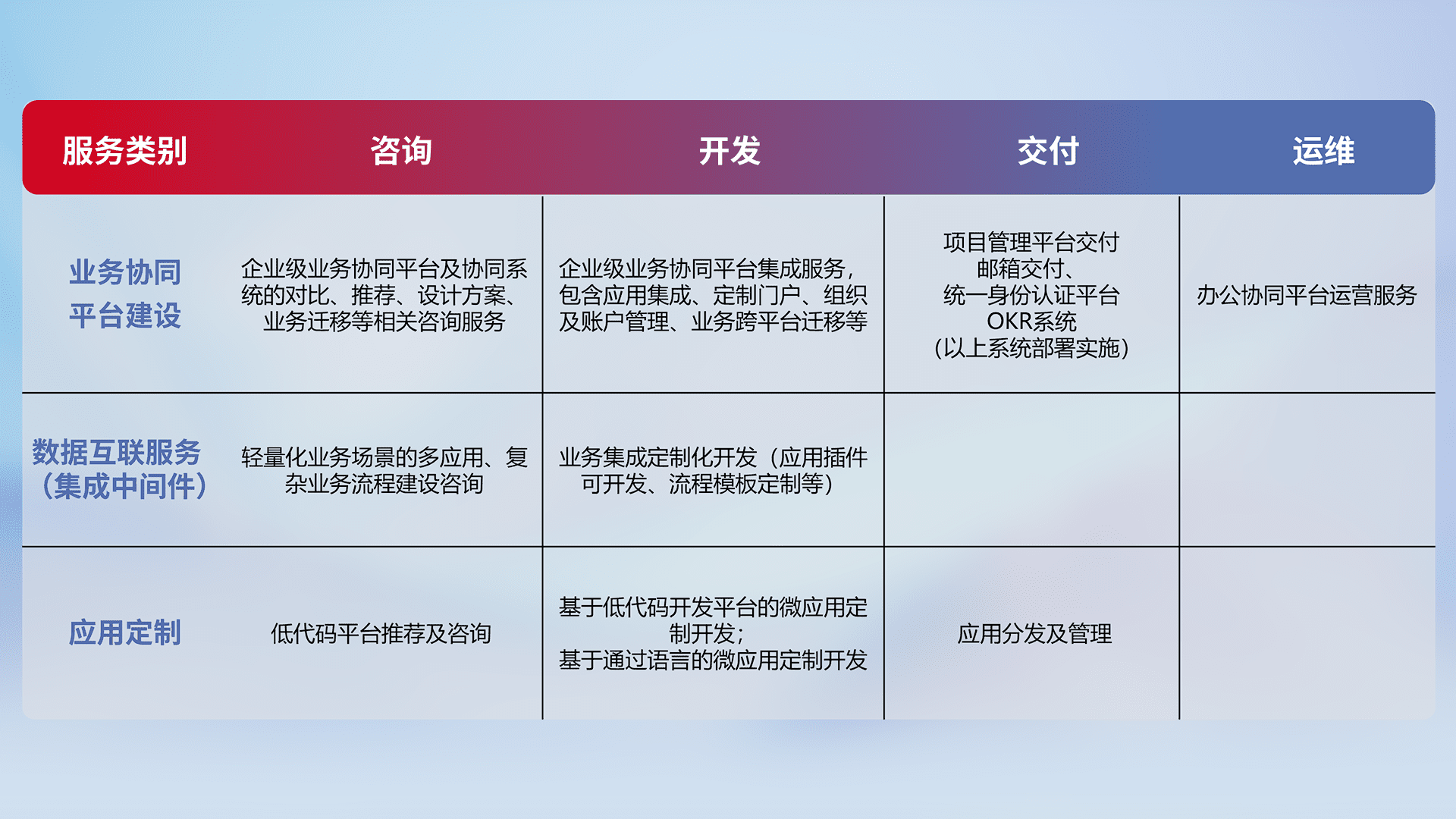 针对钉钉、、、企微、、、IDaas等平台级产品提供产品的规划、、方案、、交付、、、定制化开发等服务,,实现如统一协同办公、、、智能客户服务、、、、混合会议管理、、、智能数据查询、、、、等业务场景,,实现数字化转型。。。
